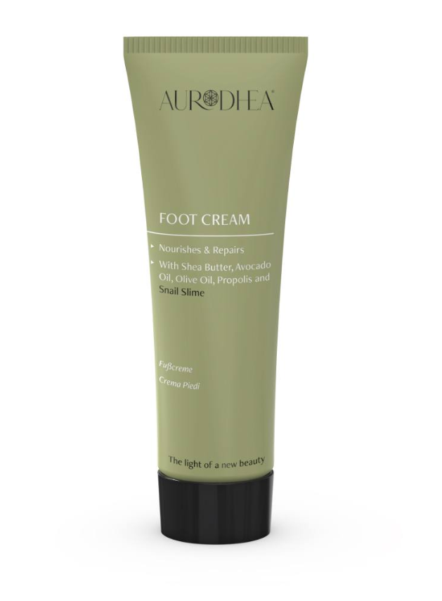 Die Aurodhea Fußcreme mit Schneckenschleim erfrischt, beruhigt und macht beanspruchte Füße wieder geschmeidig. Bei regelmäßiger Anwendung hilft sie dank der wertvollen Wirkstoffe von Schneckenschleim und Propolis, die Fußhaut weich zu machen und lästige Unreinheiten, die durch zu enge Schuhen und ständiges Reiben entstehen (wie Hornhaut und Schwielen), zu bekämpfen. Sie repariert die Fußhaut zuverlässig, indem sie die Heilung fördert und rissige Füße beruhigt. Angereichert mit Sheabutter, Mandelöl, Avocadoöl und Olivenöl pflegt die Creme die Füße besonders intensiv und macht sie geschmeidig und glatt.