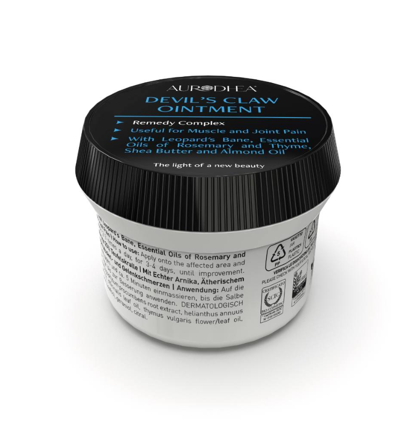Die Salbe mit Teufelskralle von Aurodhea lindert Schmerzen und Entzündungen bei Arthrose, Rückenschmerzen, Halswirbelsäulenarthrose, Verstauchungen, Prellungen, Ischias, Arthritis, Rheuma, Muskelsteifheit und Hauterkrankungen (einschließlich Geschwüren und Wunden). Sie hilft, die Beweglichkeit und Geschmeidigkeit der Gelenke der Gelenke zu verbessern und gilt als Alternative zu den herkömmlichen entzündungshemmenden Behandlungen: Sie eignet sich auch hervorragend bei Sportbeschwerden wie Sehnenscheidenentzündungen. Die Salbe ist mit Sheabutter und Mandelöl angereichert und enthält zudem Arnikaextrakt sowie ätherische Öle aus Rosmarin und Thymian, die für ihre beruhigenden, schmerzstillenden und entzündungshemmenden Eigenschaften bekannt sind.